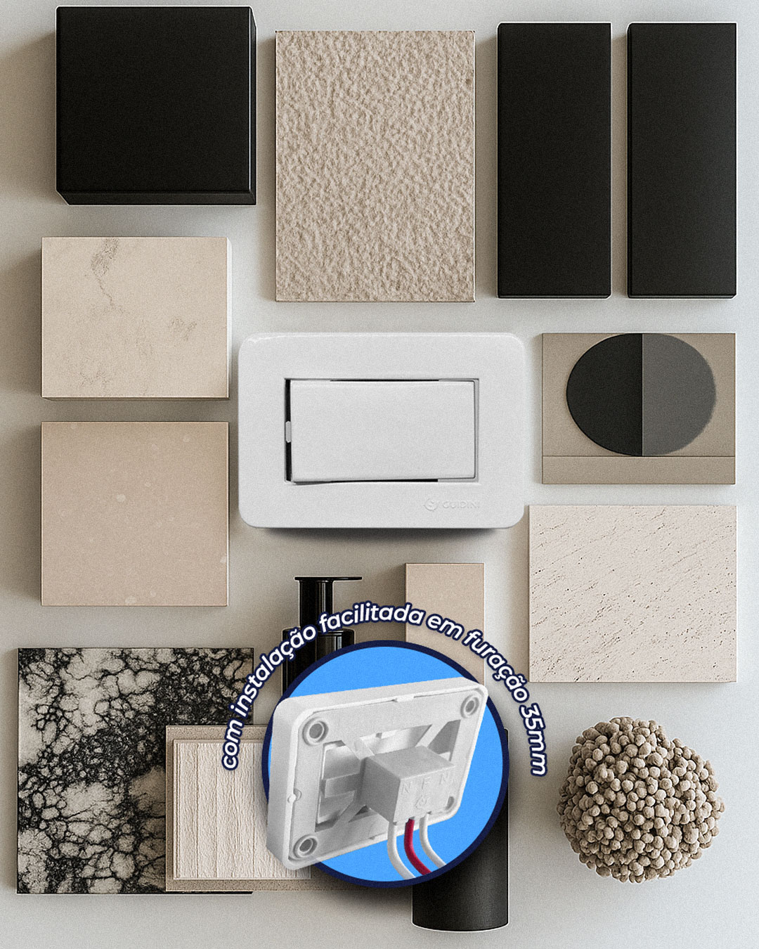 Bem-vindo à revolução da praticidade em eletricidade doméstica! Apresentamos a linha de tomadas e interruptores para Móveis da linha Easy Install da Guidini Electric, projetada para simplificar sua vida em casa ou no escritório. Com um design inovador e o exclusivo Sistema EasyPut, você pode dizer adeus aos dias de fazer múltiplos furos para instalar uma tomada ou interruptor. Agora, tudo o que você precisa é de um único furo de 35mm na superfície, e pronto!